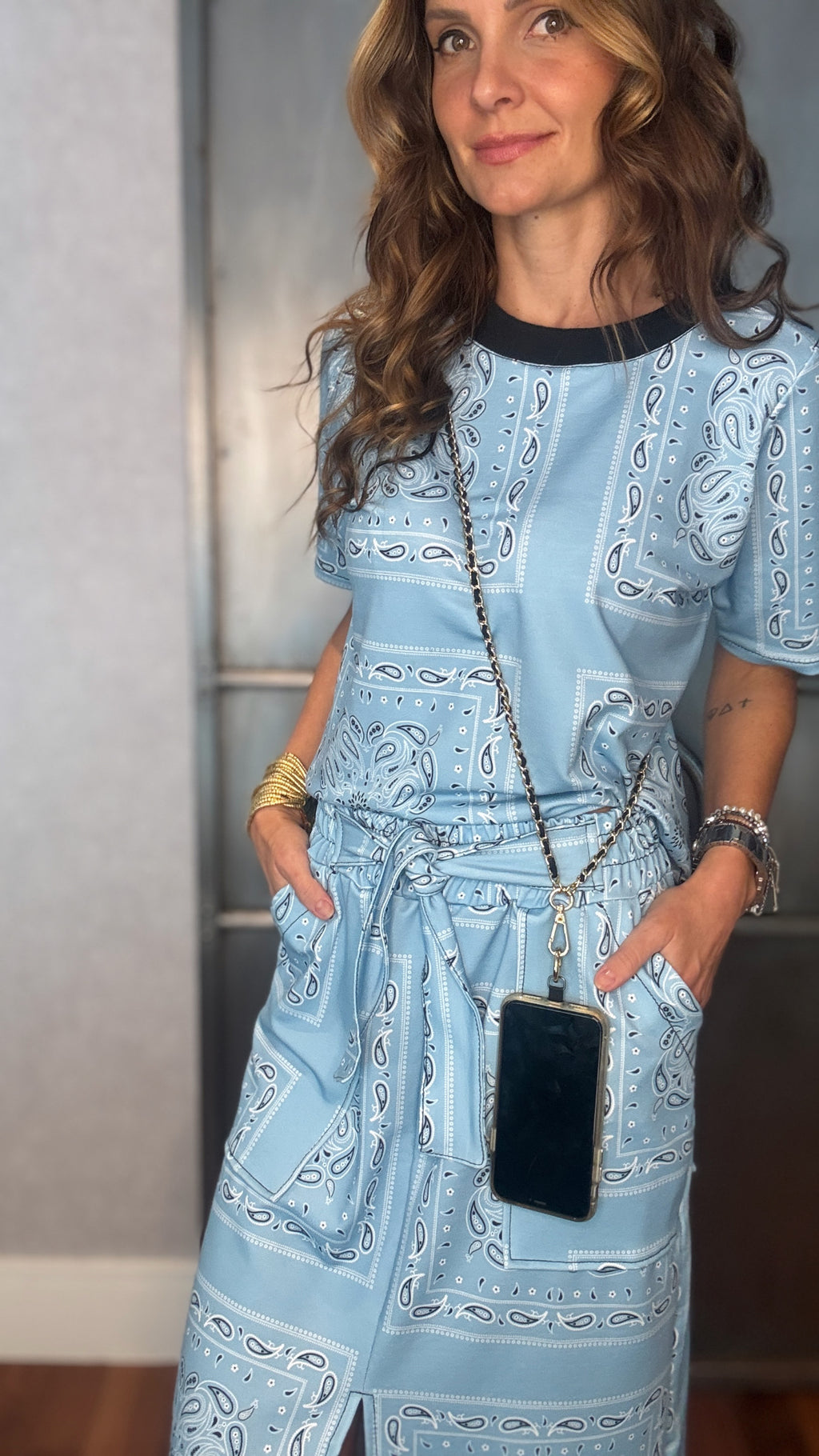 Porta celular em corrente dourada com fio interno preto, mosquetão no dourado.